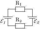 27. Чему равно падение напряжения (В) на сопротивлении R2 в приведенной схеме, если ЭДС источников ε1=9В, ε2 =6В и R2/R1=2. Внутренние сопротивления источников r1=r2=0.