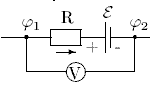 20. Определите количество теплоты (Дж), выделяемое на сопротивлении R за 10 с в части цепи, приведенной на рисунке. Показания вольтметра φ1 - φ2=8В, ε=6В и I=1А. Внутреннее сопротивление источника тока равно нулю.