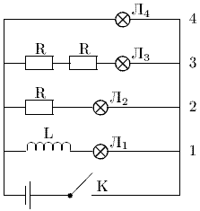 26. На рисунке приведена электрическая схема, составленная из источника тока, трех резисторов, катушки индуктивности и четырех ламп. После замыкания ключа "К" сила тока достигает максимального значения позже, чем во всех остальных, в лампе…