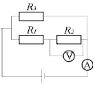 28. В приведенной схеме R1=4 Ом, R2=5 Ом и R3=18 Ом. Каково показание вольтметра (В), если показание амперметра равно 3 А? Внутренним сопротивлением источника пренебречь.