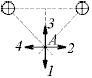 24. По двум параллельно расположенным проводникам одинаковые по величине токи текут в одном направлении, как показано на рисунке. Определите направление индукции образованного ими магнитного поля в точке А.