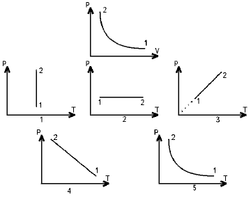 38. На рисунке в координатных осях p-V изображен график процесса изменения состояния идеального газа. Какой из графиков в координатных осях р-Т соответствует этому процессу?