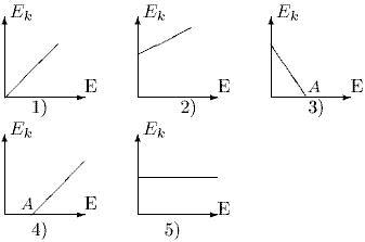 55. На каком из приведенных графиков правильно отражена зависимость максимальной кинетической энергии (Ек) электрона, вылетающего с поверхности металла, от энергии фотона (Е), падающего на поверхность металла? А - работа выхода электрона из металла.