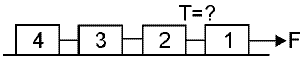 3. Четыре одинаковых бруска массой по 1 кг каждый (см.рис) движутся по гладкой горизонтальной поверхности (μ = 0) под действием горизонтальной силы 10 Н с некоторым ускорением. Определите силу натяжения нити между первым и вторым брусками (Н).